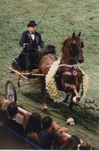Callaway’s Copyright and John T. Jones winning the 2002 Fine Harness Worlds Grand Championship at the KSF.